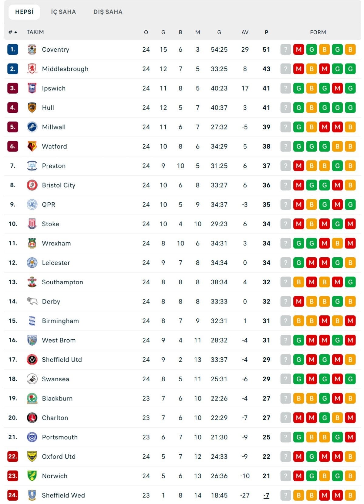 İNGİLTERE CHAMPIONSHIP’TE PUAN DURUMU