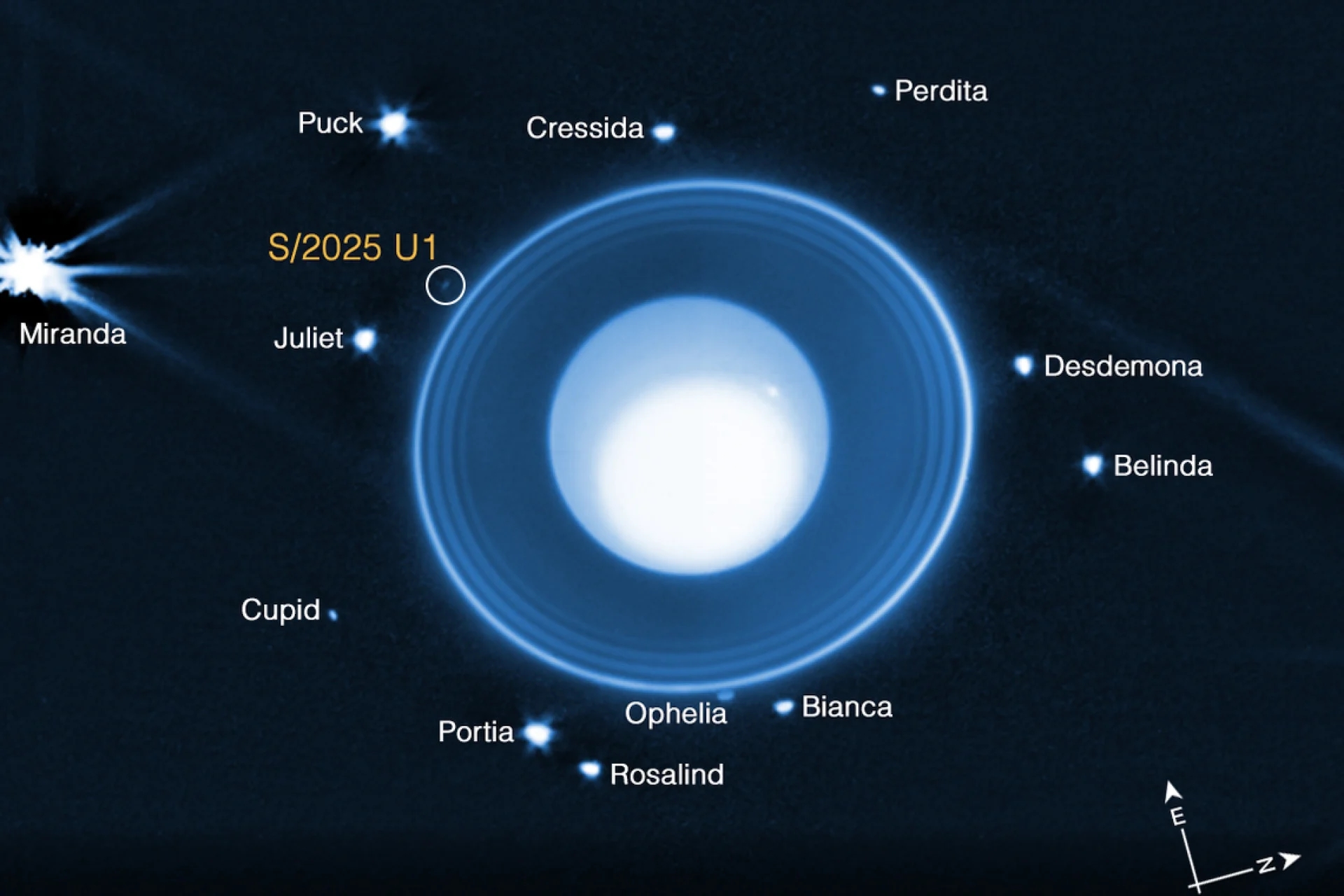 NASA’nın James Webb Uzay Teleskobu, bu yıl Uranüs’ün yörüngesinde daha önce fark edilmeyen bir uydu keşfetti. S/2025 U1 adı verilen bu küçük uydu, yaklaşık 40 yıl önce Voyager 2 tarafından gerçekleştirilen Uranüs geçişinde fark edilmemişti. Webb’in güçlü Yakın Kızılötesi Kamerası (NIRCam) sayesinde Şubat ayında keşfedildi. Astronomlar, uydunun Uranüs’ün iç halkalarının kenarında, ekvatoryal düzlemde yaklaşık 56.000 kilometre uzaklıkta bulunduğunu belirledi. Yaklaşık 10 kilometre çapında olan bu küçük uydu, Uranüs’ün daha pek çok gizli uydusu olabileceğini gösteriyor.