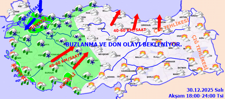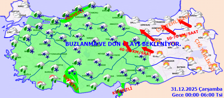 BUZLANMA VE DON OLAYI UYARISI: Ülkemizin kuzey, iç ve doğu kesimlerinde buzlanma ve don olayı beklendiğinden yaşanabilecek olumsuzluklara karşı dikkatli ve tedbirli olunması gerekmektedir.