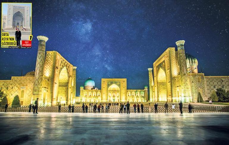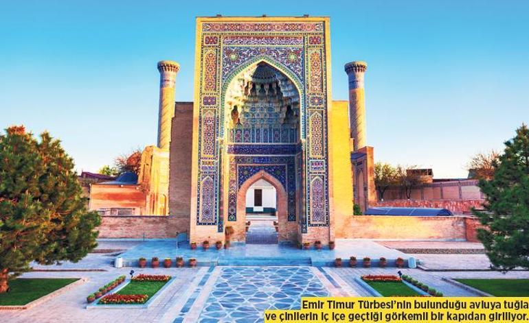 Taşkent’ten sonraki durağımız Semerkand’a hızlı tren ile gidiyoruz. Normalde yedi-sekiz saat sürecek yolu iki saatte alıyoruz. Buradaki ilk durak Emir Timur Türbesi. Tuğla ve çinilerin iç içe geçtiği görkemli bir kapıdan giriliyor türbenin bulunduğu avluya. Karşıdaki eyvanın içindeki camdan, türbeyi görebiliyoruz. Koyu yeşim taşından bir mozolesi var Timur’un. Dönemin mutasavvıflarından birinin ayak ucunda; sağında ise torunu Uluğ Bey. Mezarı başka bir alanda. Sarı ışıklarla aydınlatılmış tillekari (altın kaplama) işlemeler içinde görkemli bir 15. YY yapısı. Merkezi kubbe yıldız deseninde mavi yeşil çinilerle işlenmiş. Türbenin içindeki derinlikli boşluk tamamlıyor Orta Asya’nın en güzel yapılarından biri olan türbeyi.