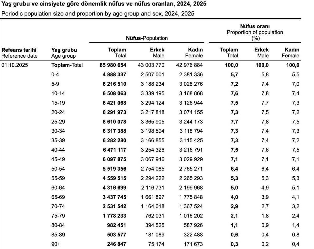 Böylece ülke nüfusu, 1 Ekim itibarıyla 85 milyon 980 bin 654 kişiye ulaştı.